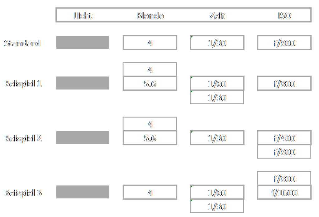 Aus diesem Grund muss auf eine tiefe Lichtempfindlichkeit geachtet werden. Wenn der ISO-Wert verdoppelt wird (z.B. von 200 auf 400) kann mit der halben Lichtmenge fotografiert werden.